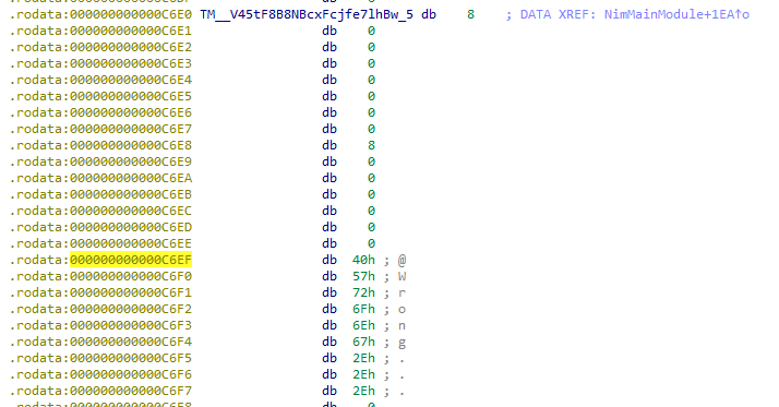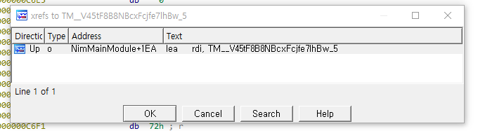 이곳에서 문자열을 확인할 수 있는데, 문자열의 시작 부분에 ; DATA XREF: 라는 주석처리된 문자가 보일 것이다. ida에서는 특정 문자열을 코드에서 찾아주는 기능을 제공한다. 사진에서 보이는 TM__~~~ 부분을 마우스 클릭하고 x를 누르면 문자열이 사용된 코드를 보여준다.
