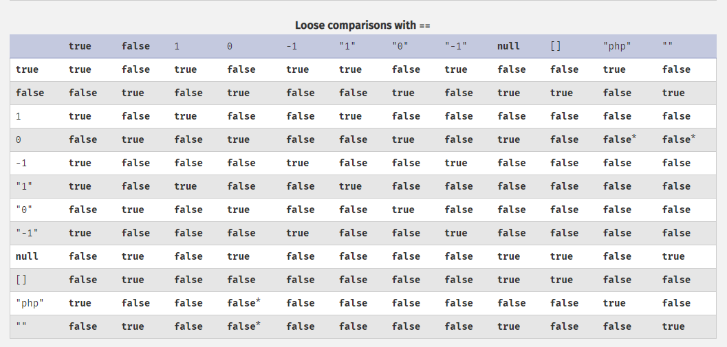 이것은 ==에 대한 표이다. 여기서 되게 신기한 점이 있는데, true와 false 두 변수만을 이용해서 모든 == 조건을 통과할 수 있다는 것이다. 특히, true는 문자열과 비교할 때 true를 반환하니 이 점도 알아두면 좋겠다. 이번 문제의 취약점도 true와 문자열의 비교가 true를 반환한다는 것에 있다.