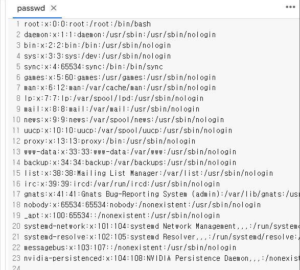 etc 폴더에 있는 passwd 파일에는 user들의 정보가 들어가 있다. : 를 구문자로 순서대로 계정, 가려진 패스워드, UID, GID, GECOS, 홈 디렉터리, 로그인 때 실행하는 shell 프로그램이다. 우리가 봐야하는 부분은 홈 디렉터리를 dev로 사용하는 sys 사용자이다. 이 점을 이용해 우리는 fd 파일에 접근할 수 있다.