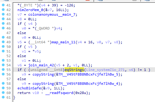 [ida를 통한 문자열 찾기 (3)] 그림을 참고할 때 코드의 56번째 줄이 Wrong...문자열인가 보다. 여기서 문자열을 비교하는 eqStrings가 보인다. key가 무엇인지는 모르지만 이 함수를 gdb로 확인해보면 비교하는 두 문자열이 나올 것이다.