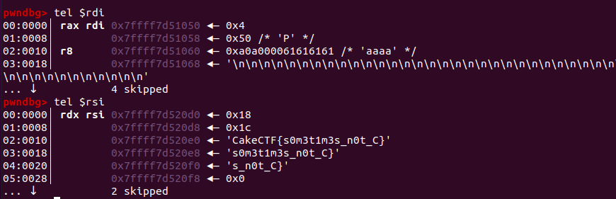 x64 환경에서 함수의 인자를 레지스터에 저장한다 이 점을 이용해 telescope 명령어를 통해 레지스터의 값을 확인하니 플래그 값이 나왔다. (x86 환경에서는 스택을 확인하면 될 것)