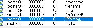 실행파일을 실행시키면 Wrong...이 나온다. 이 말은 프로그램 상에 Wrong...이라는 문자가 저장되어 있다는 뜻이며 그러한 문자가 사용된다는 뜻이겠다. 그 위치를 ida로 찾아낼 수 있다.