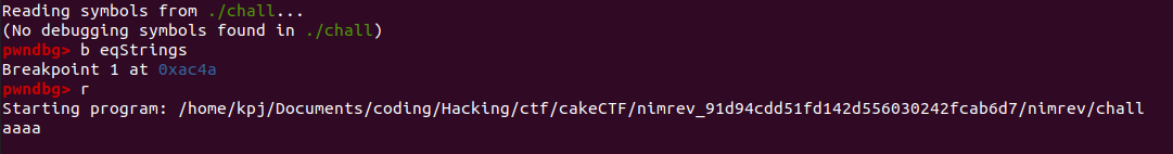 break 명령어로 eqStrings 함수에서 멈춘 후, run으로 실행시켰다. 입력 문자는 아무 필요 없으니 아무렇게나 입력헀다.