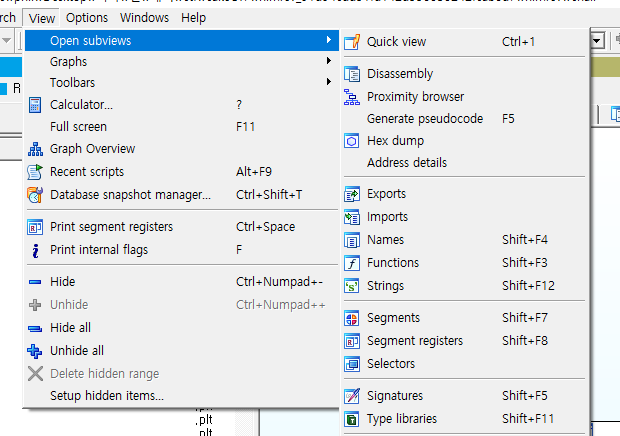 ida에서 실행파일을 로드시킨 후 View → Open subviews 옵션에서 String를 찾을 수 있다. (만약 이 곳에 없다면 Names도 찾아보자.)